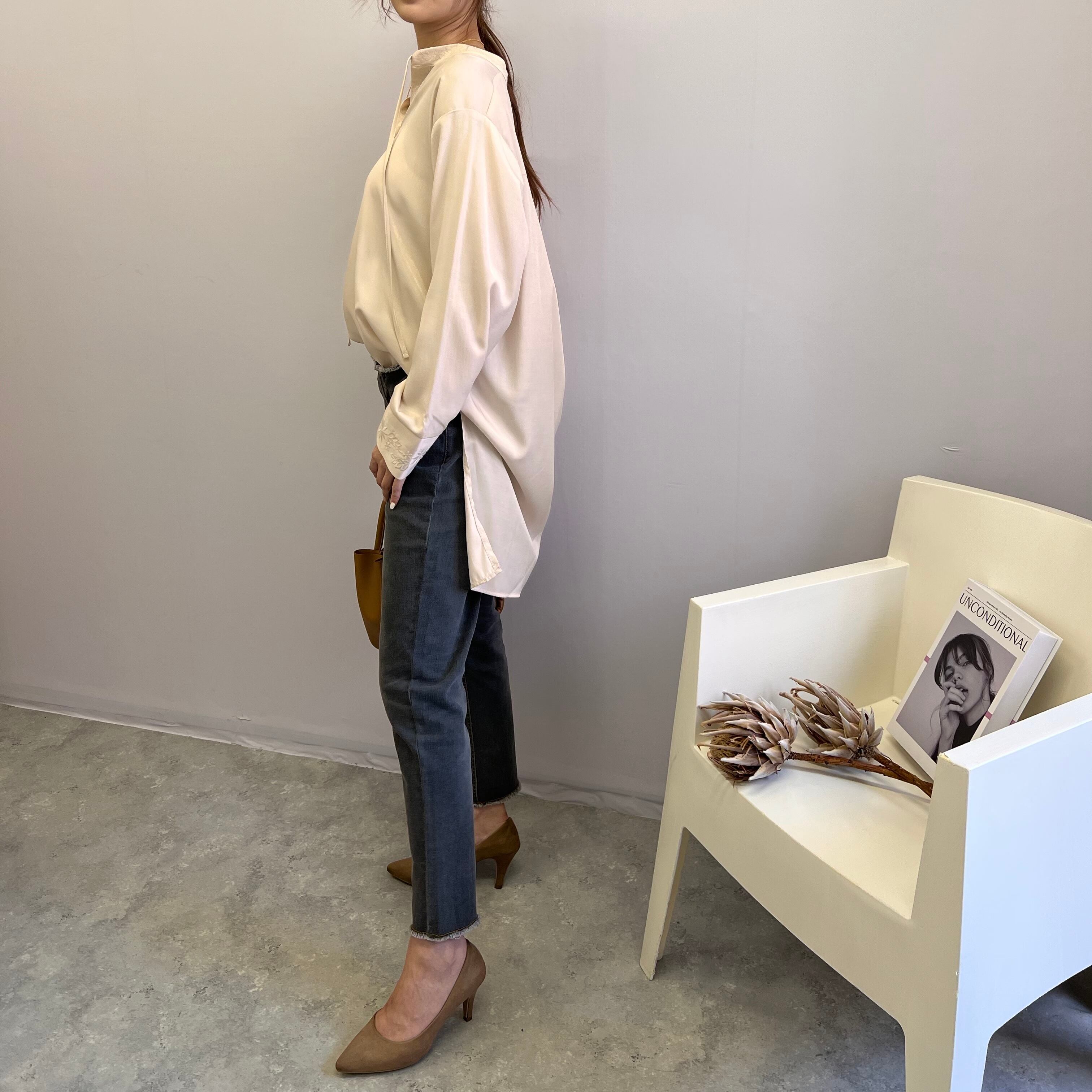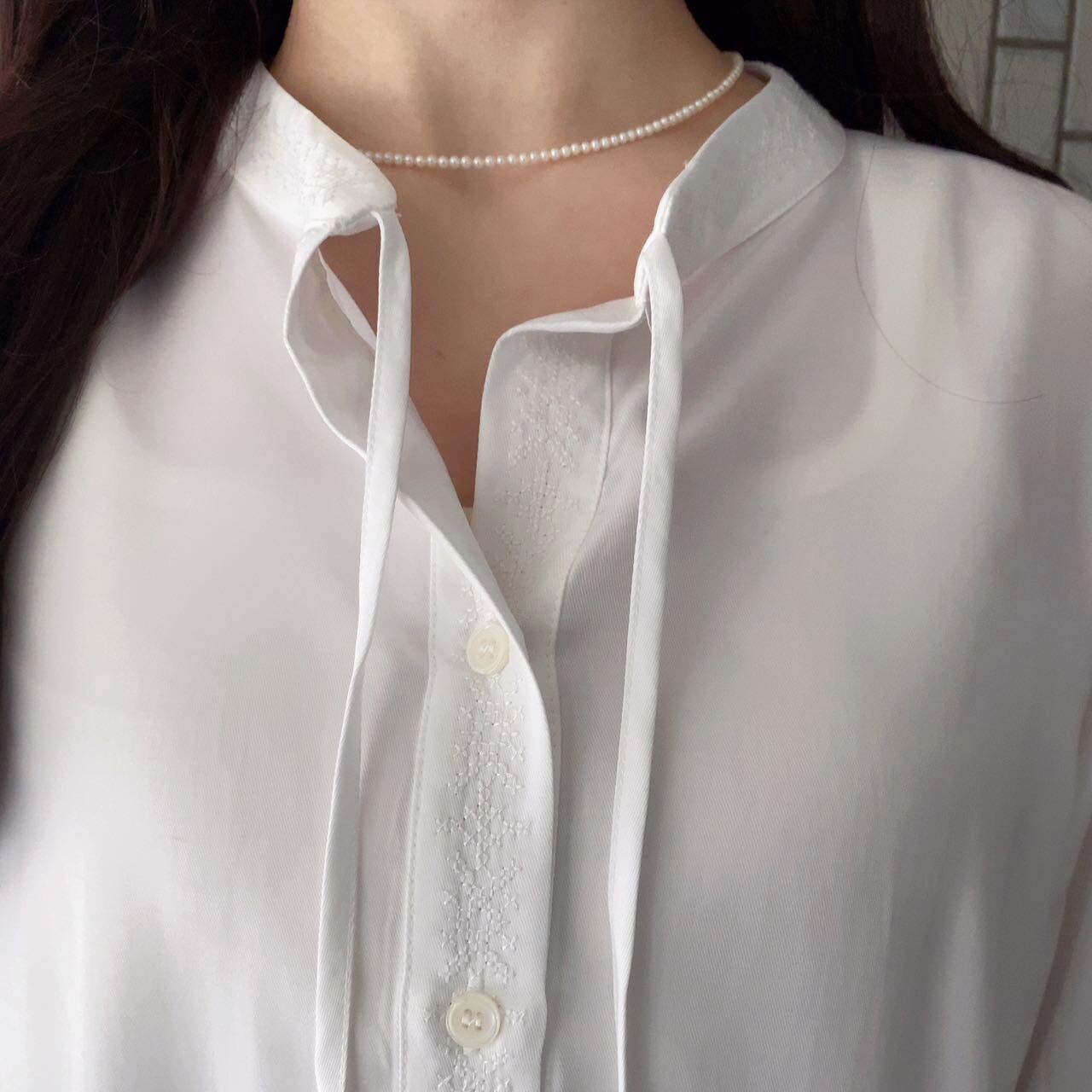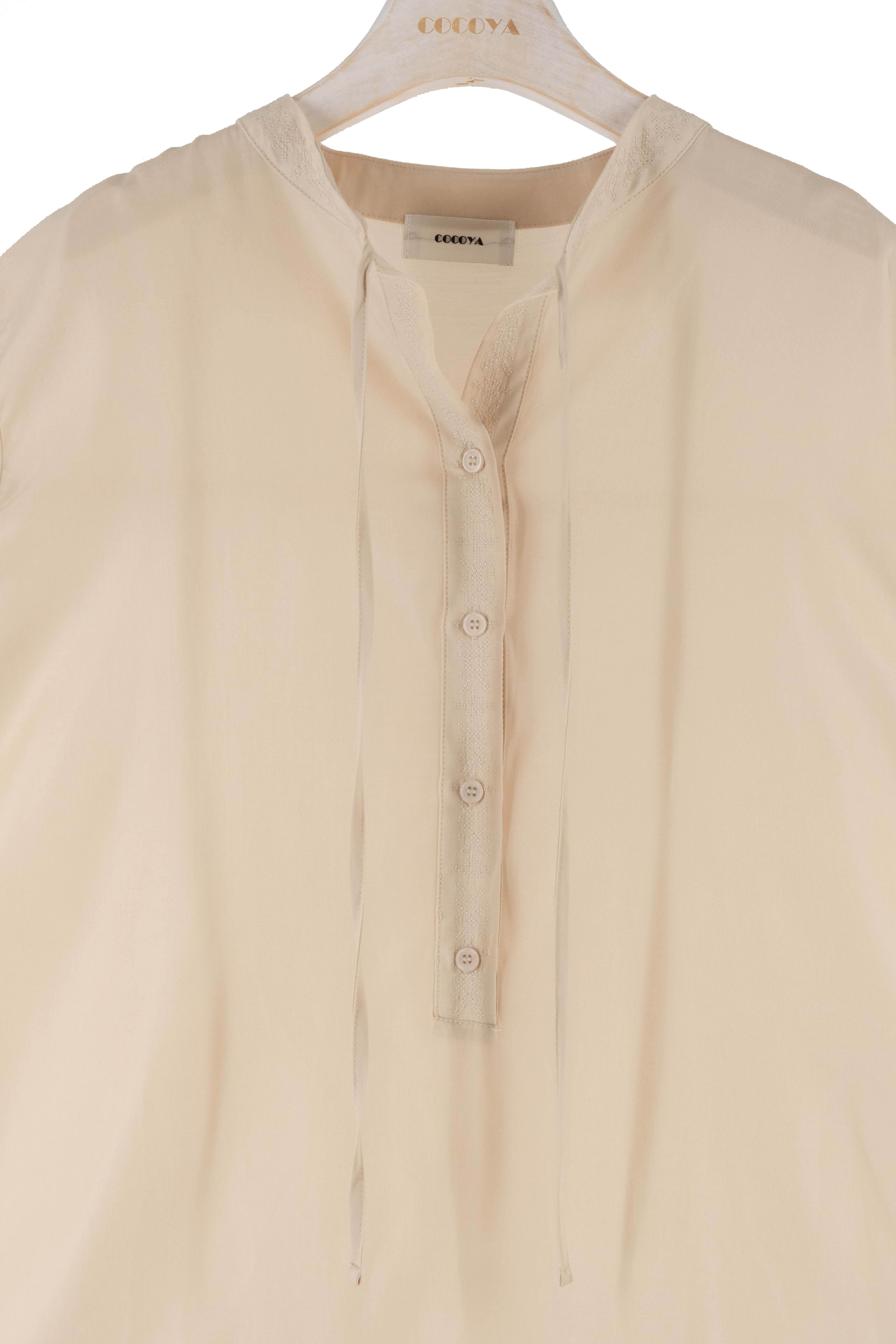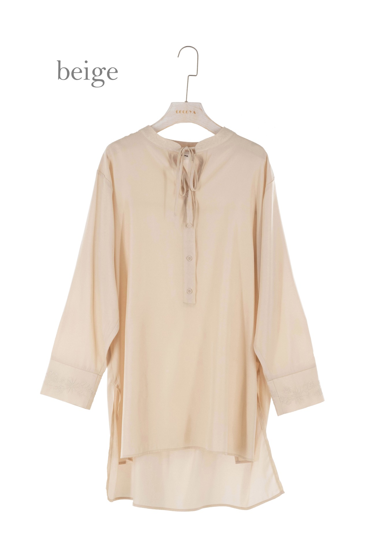 衿元と袖口に同色の刺繍が入ったチュニックです。